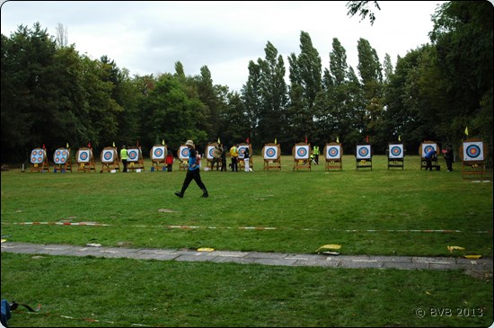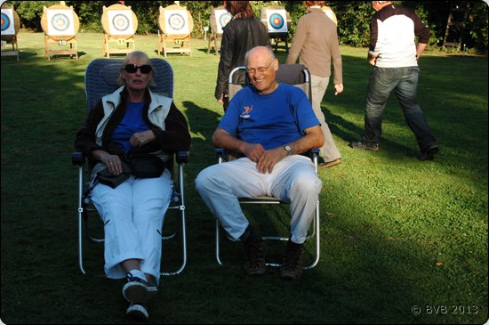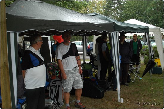 Wir hatten uns zum zweiten Durchgang gemeldet. Beim Wechsel wurde es unter den Unterständen eng und hektisch, doch das normalisierte sich schnell. Noch bevor die Bögen aufgebaut waren, fand auch schon die Bogenkontrolle statt. Man wollte wohl die verlorene Zeit wieder aufholen. Manch einer konnte erst mit etwas Verspätung seinen Bogen zeigen. |